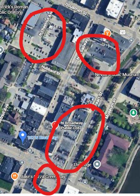 In addition to street parking, there are several metered, public parking lots nearby. The map below shows a few options.